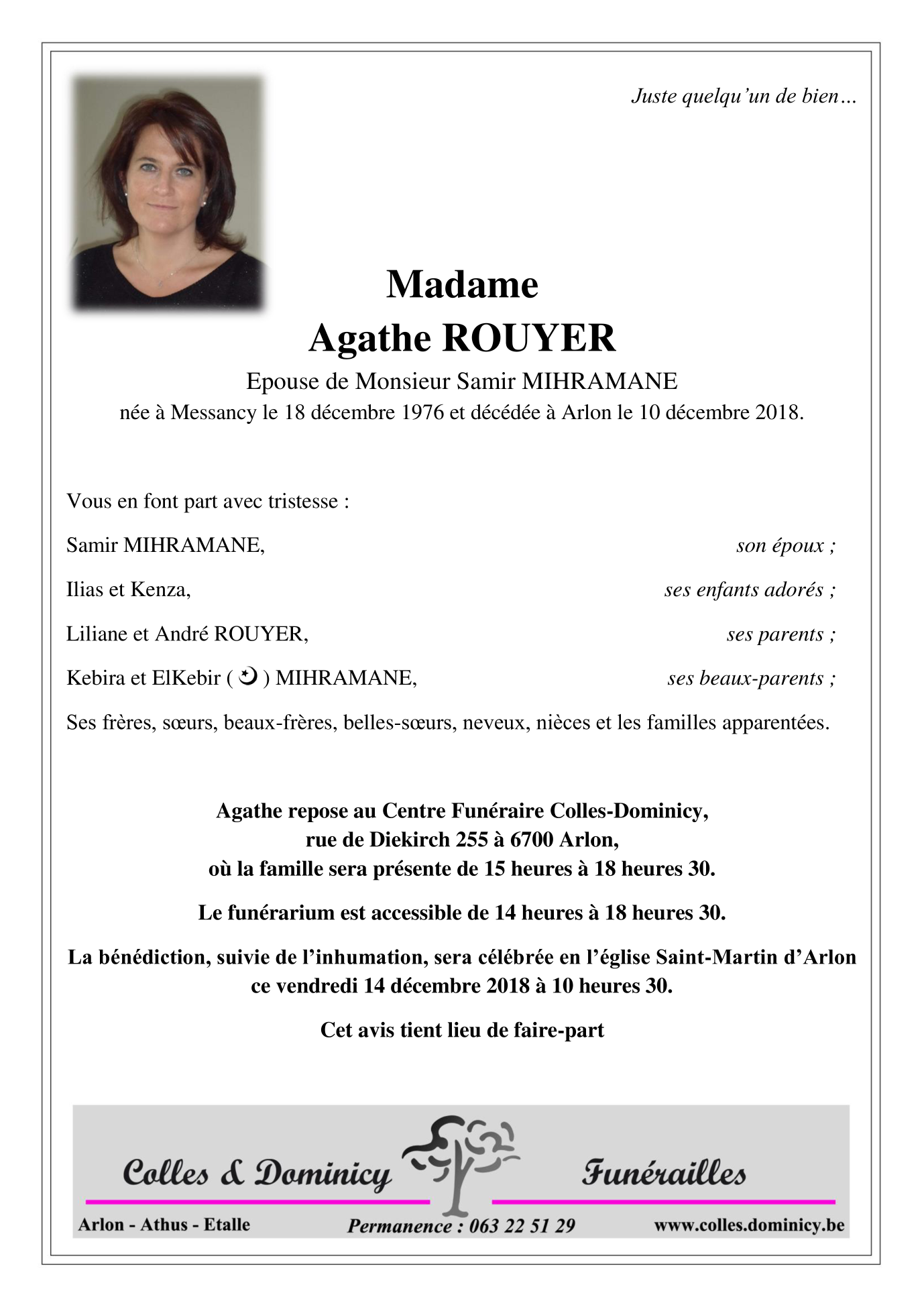 Décédée à Arlon (6700) le lundi 10 décembre 2018 à l'âge de 41 ans