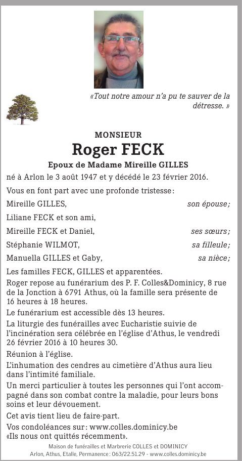 Décédé à Arlon (6700) le mardi 23 février 2016 à l'âge de 68 ans