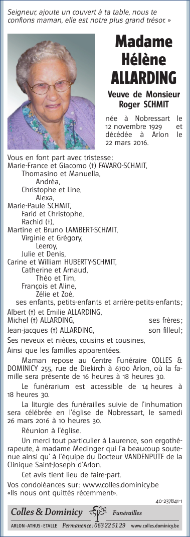 Décédée à Arlon (6700) le mardi 22 mars 2016 à l'âge de 86 ans