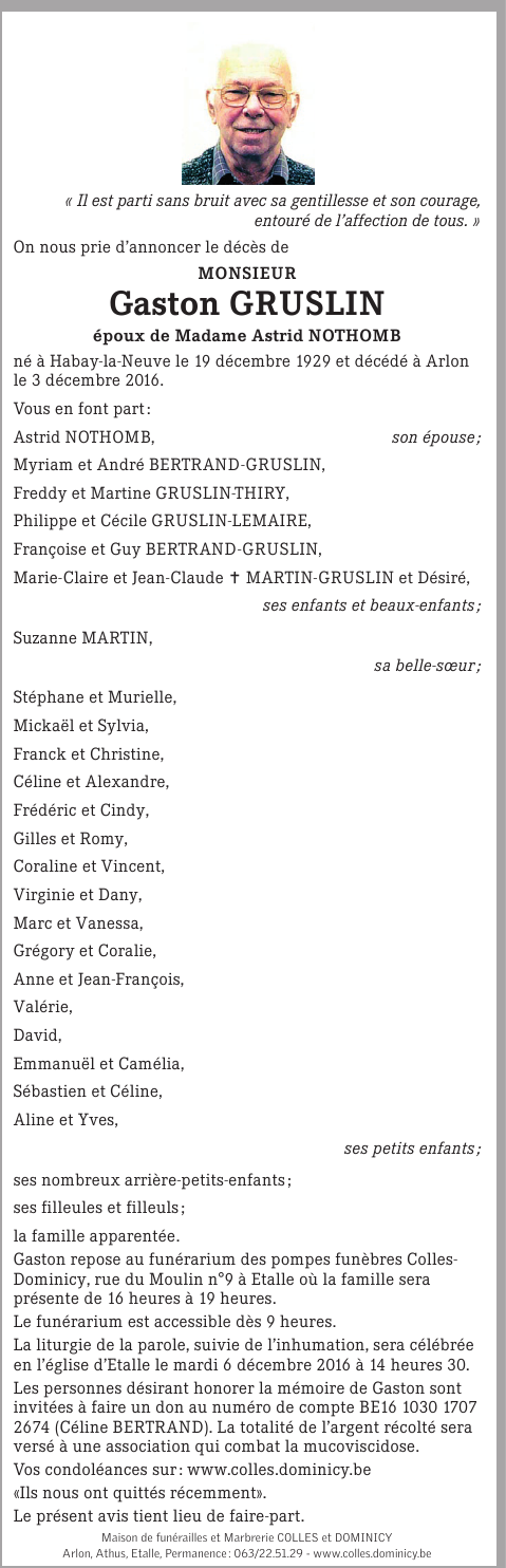 Décédé à Arlon (6700) le samedi 3 décembre 2016 à l'âge de 86 ans