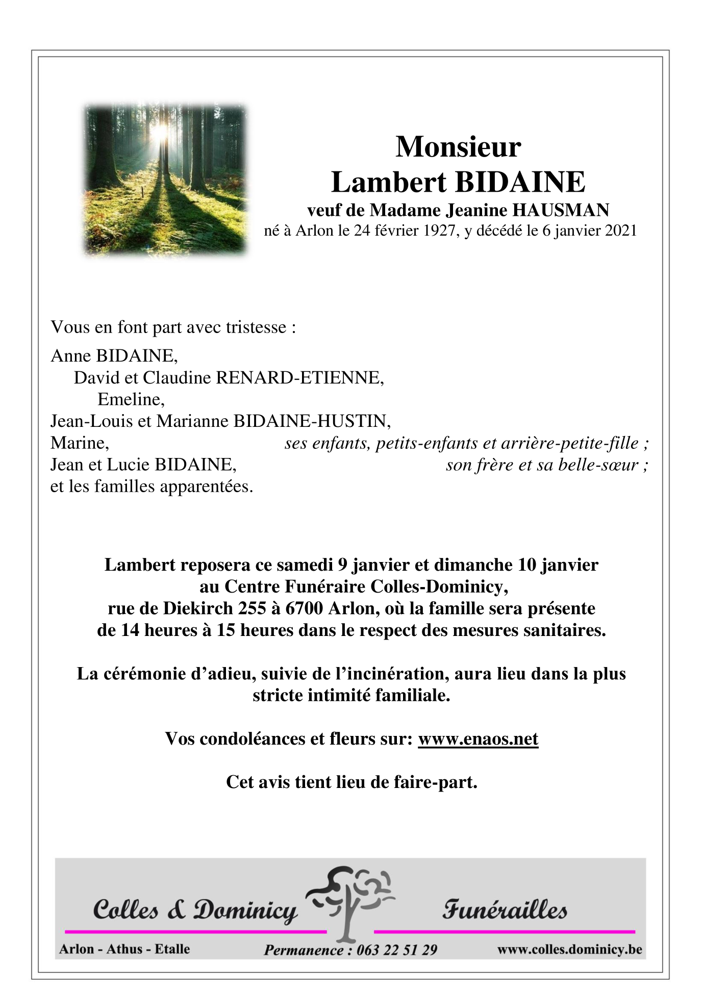 Décédé à Arlon (6700) le mercredi 6 janvier 2021 à l'âge de 93 ans