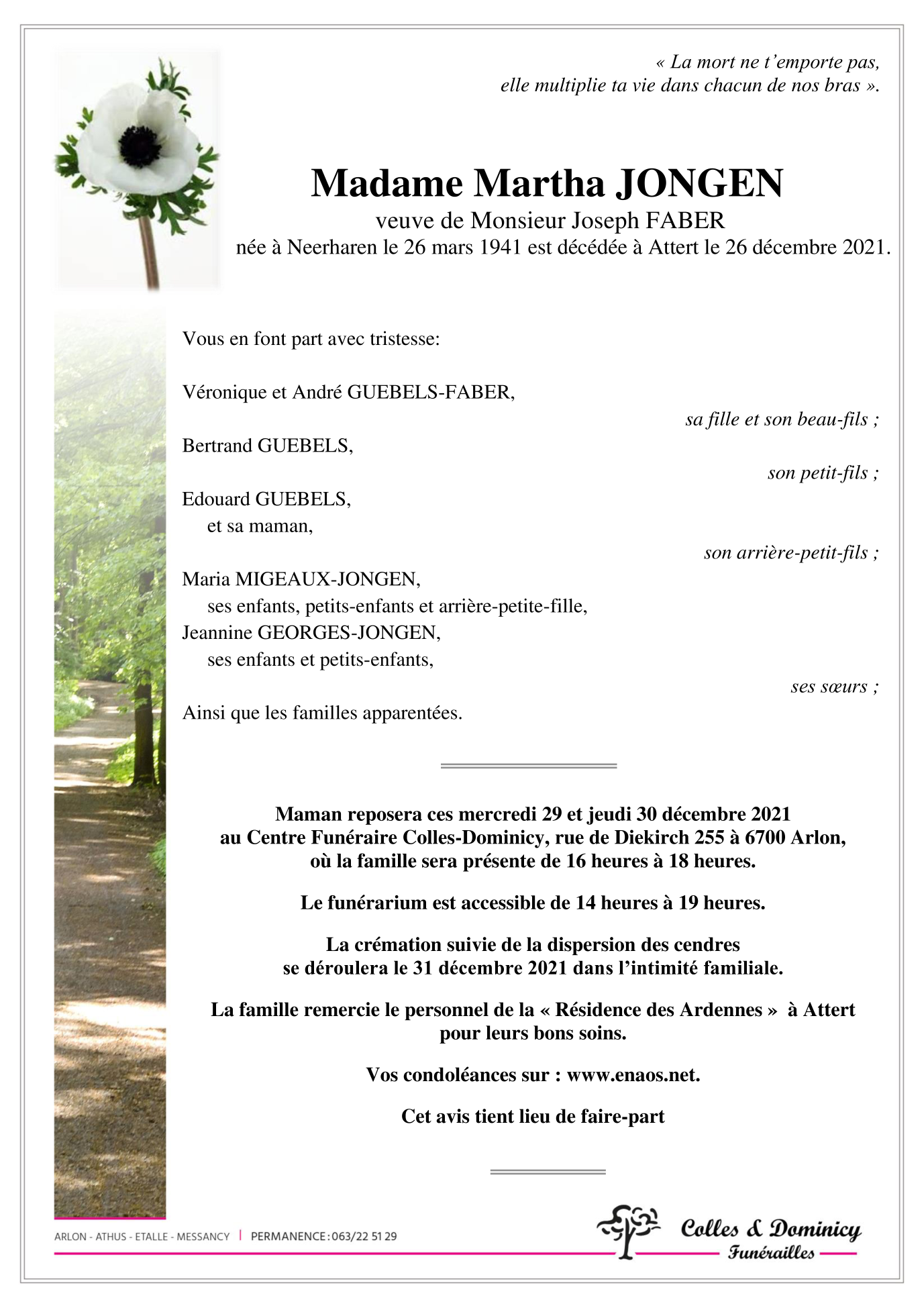 Décédée à Attert (6717) le dimanche 26 décembre 2021 à l'âge de 80 ans