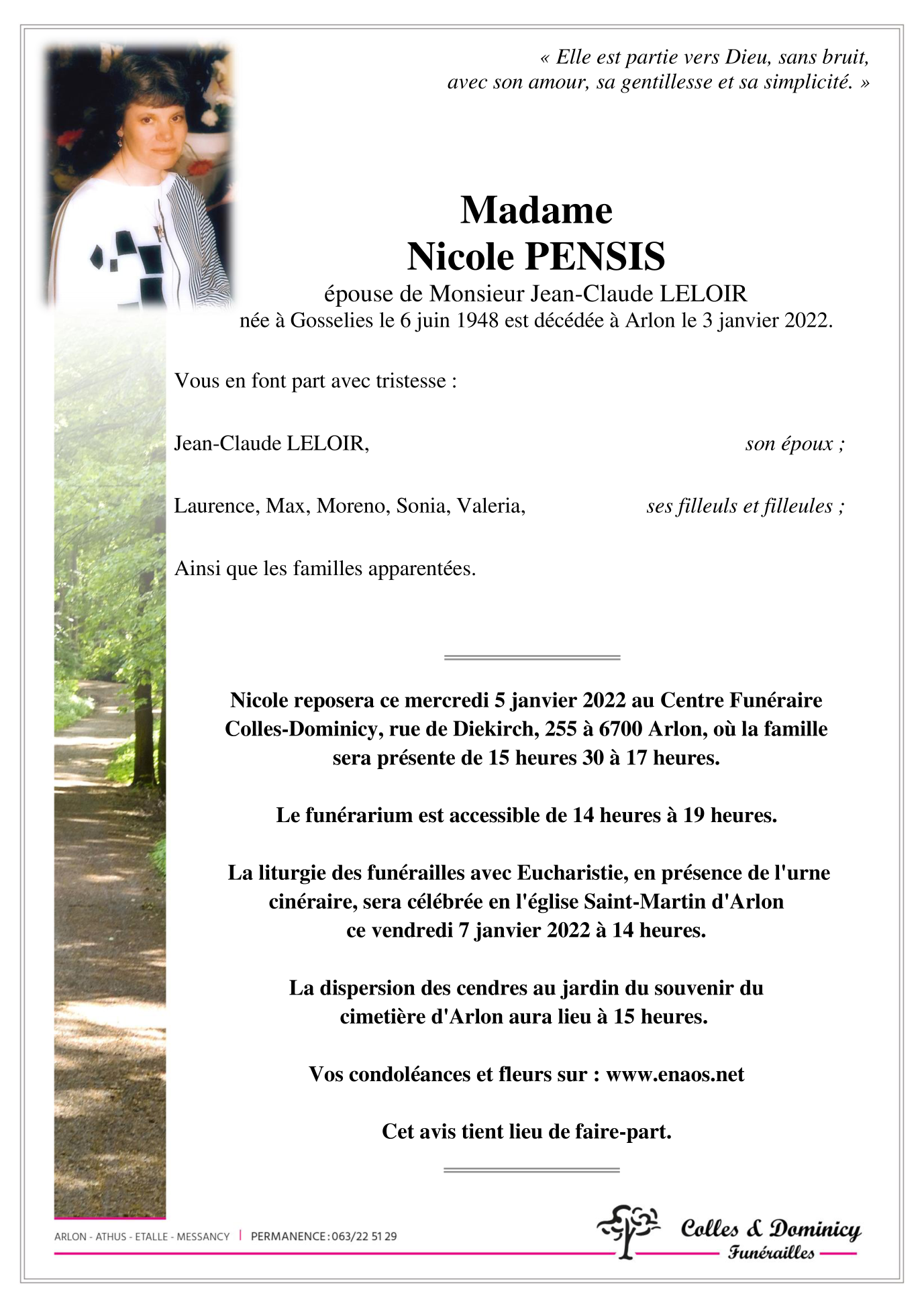 Décédée à Arlon (6700) le lundi 3 janvier 2022 à l'âge de 73 ans
