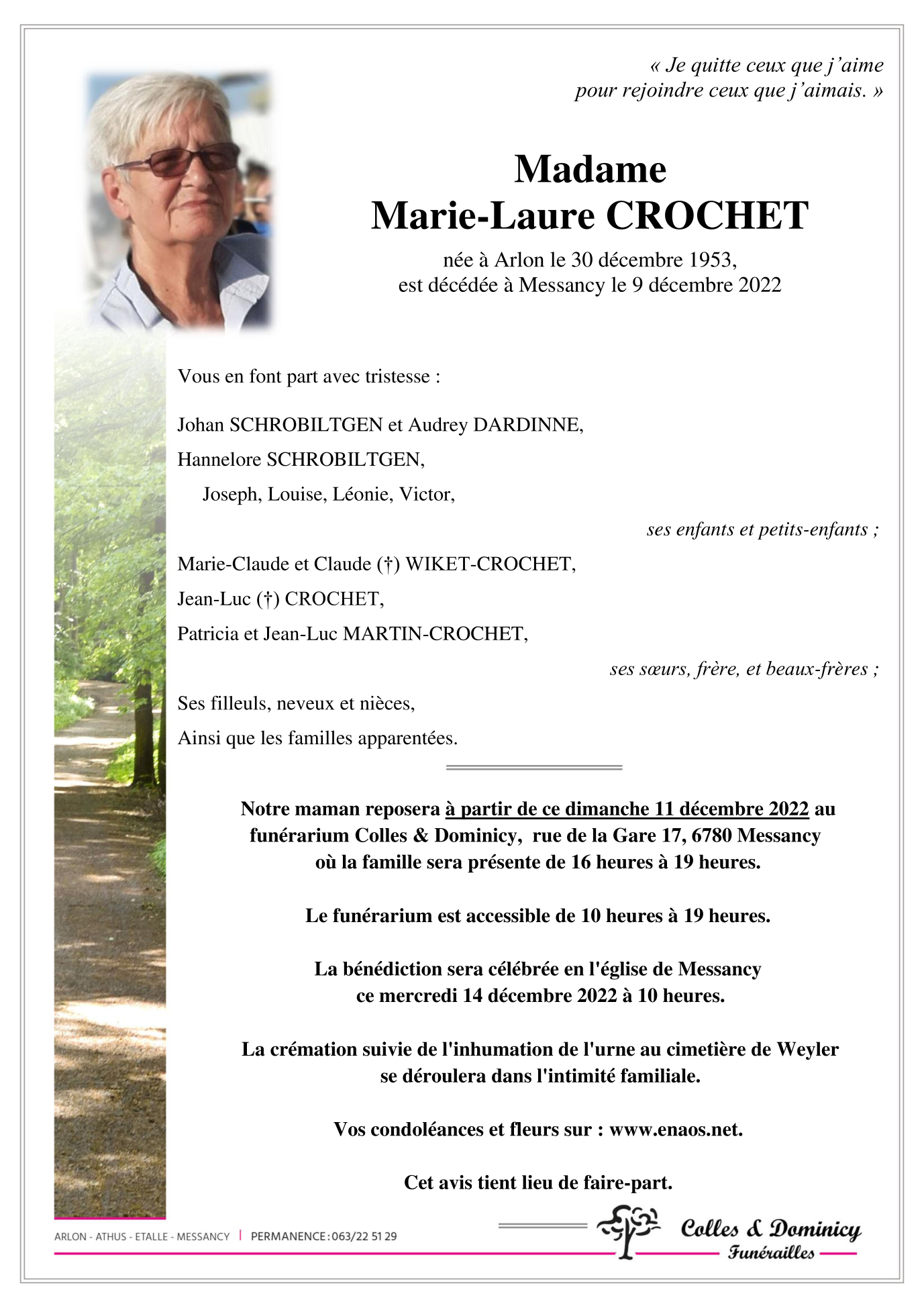 Décédée à Messancy (6780) le vendredi 9 décembre 2022 à l'âge de 68 ans