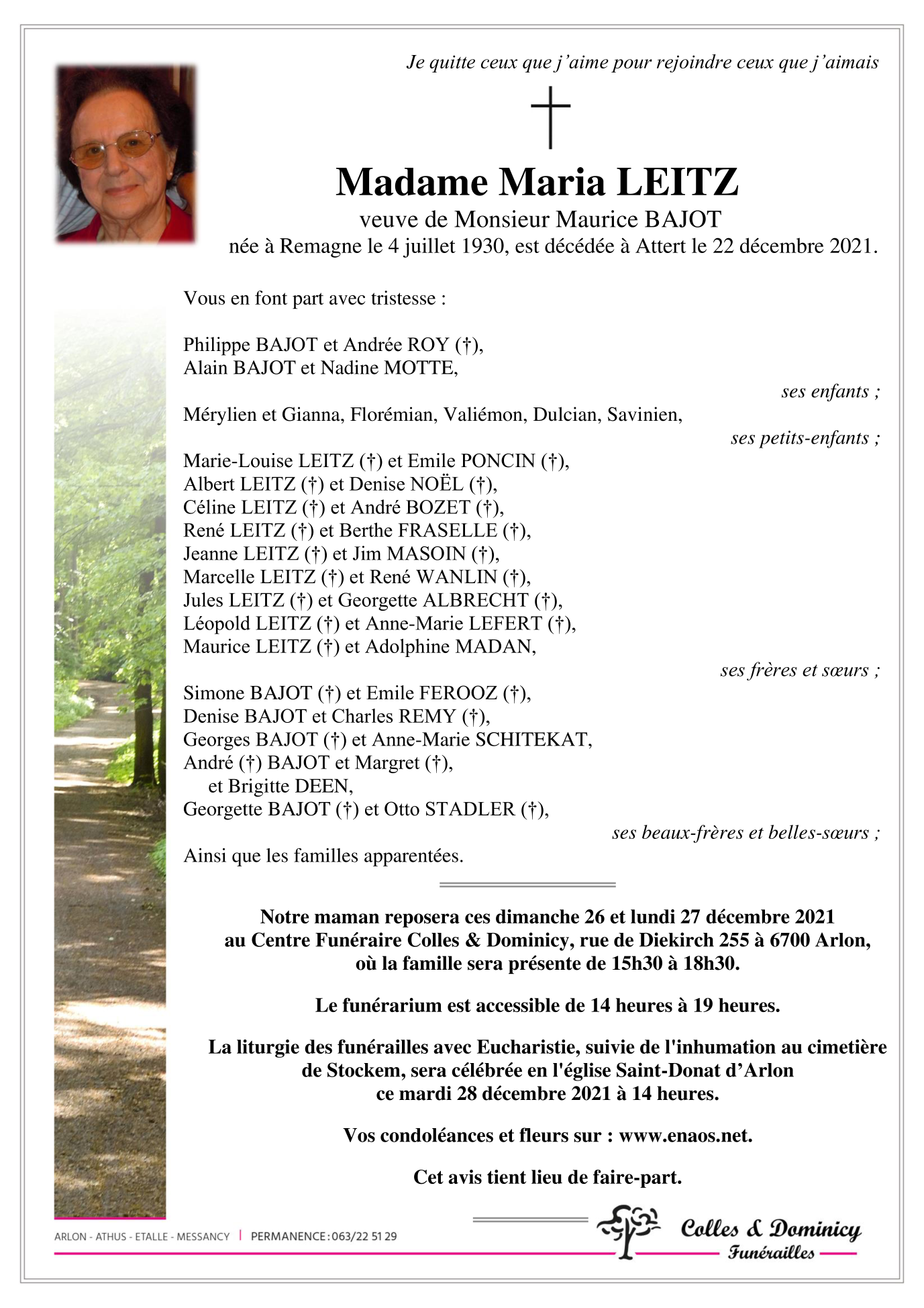 Décédée à Attert (6717) le mercredi 22 décembre 2021 à l'âge de 91 ans