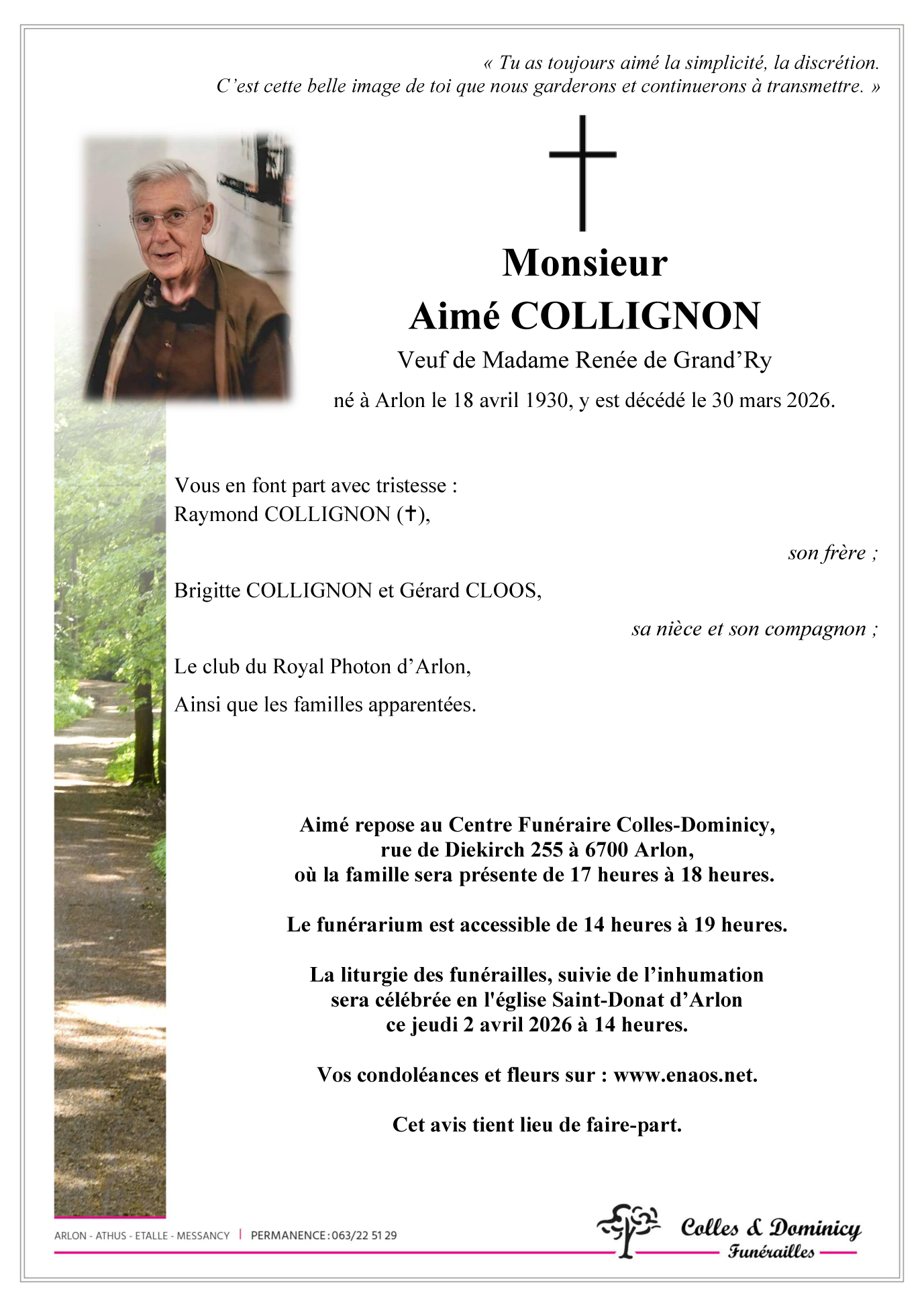 Décédé à Arlon (6700) le lundi 30 mars 2026 à l'âge de 95 ans