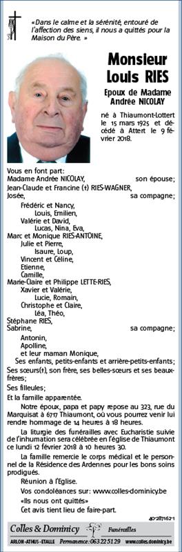 Décédé à Attert (6717) le vendredi 9 février 2018 à l'âge de 92 ans