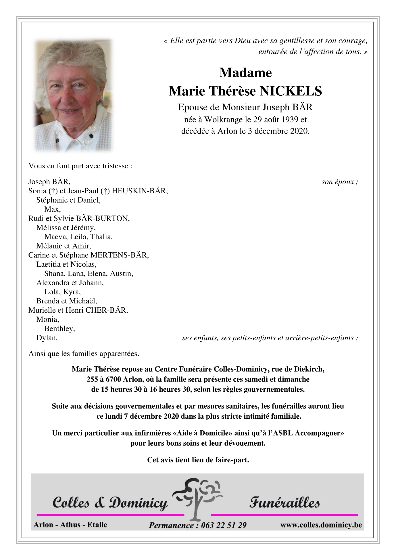 Décédée à Arlon (6700) le jeudi 3 décembre 2020 à l'âge de 81 ans