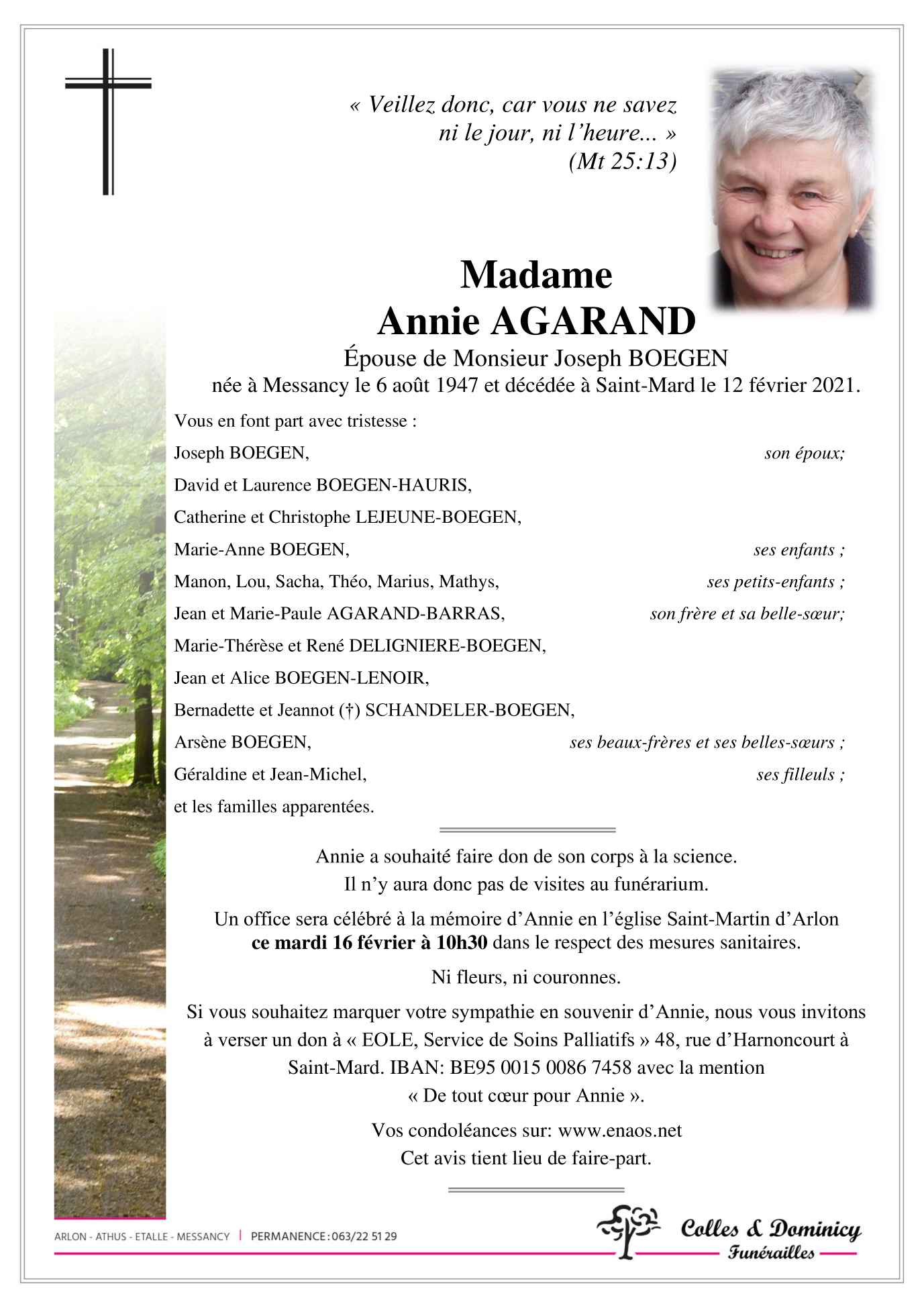 Décédée à Saint-Mard (6762) le vendredi 12 février 2021 à l'âge de 73 ans