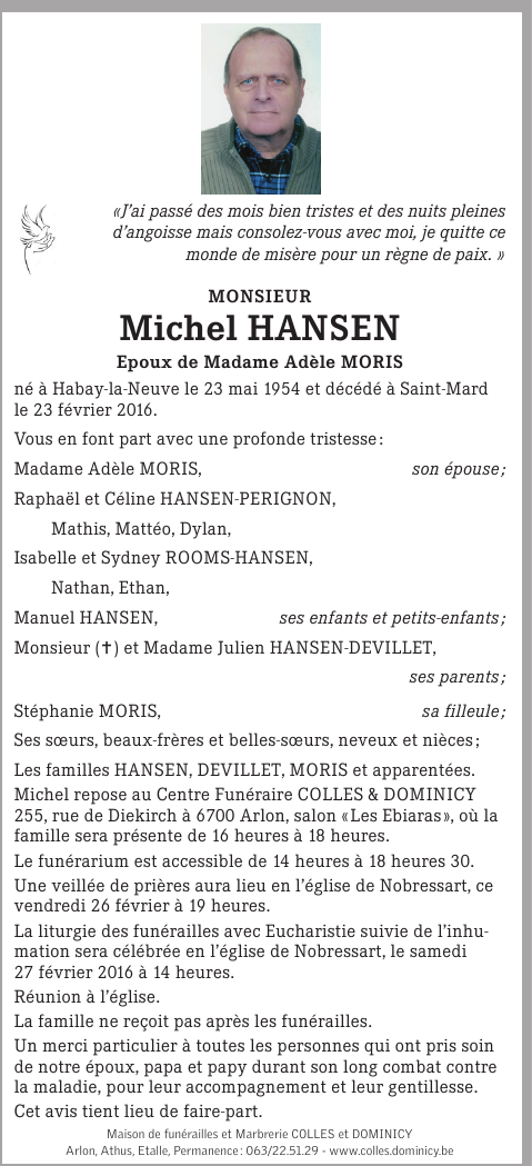 Décédé à Virton (6760) le mardi 23 février 2016 à l'âge de 61 ans