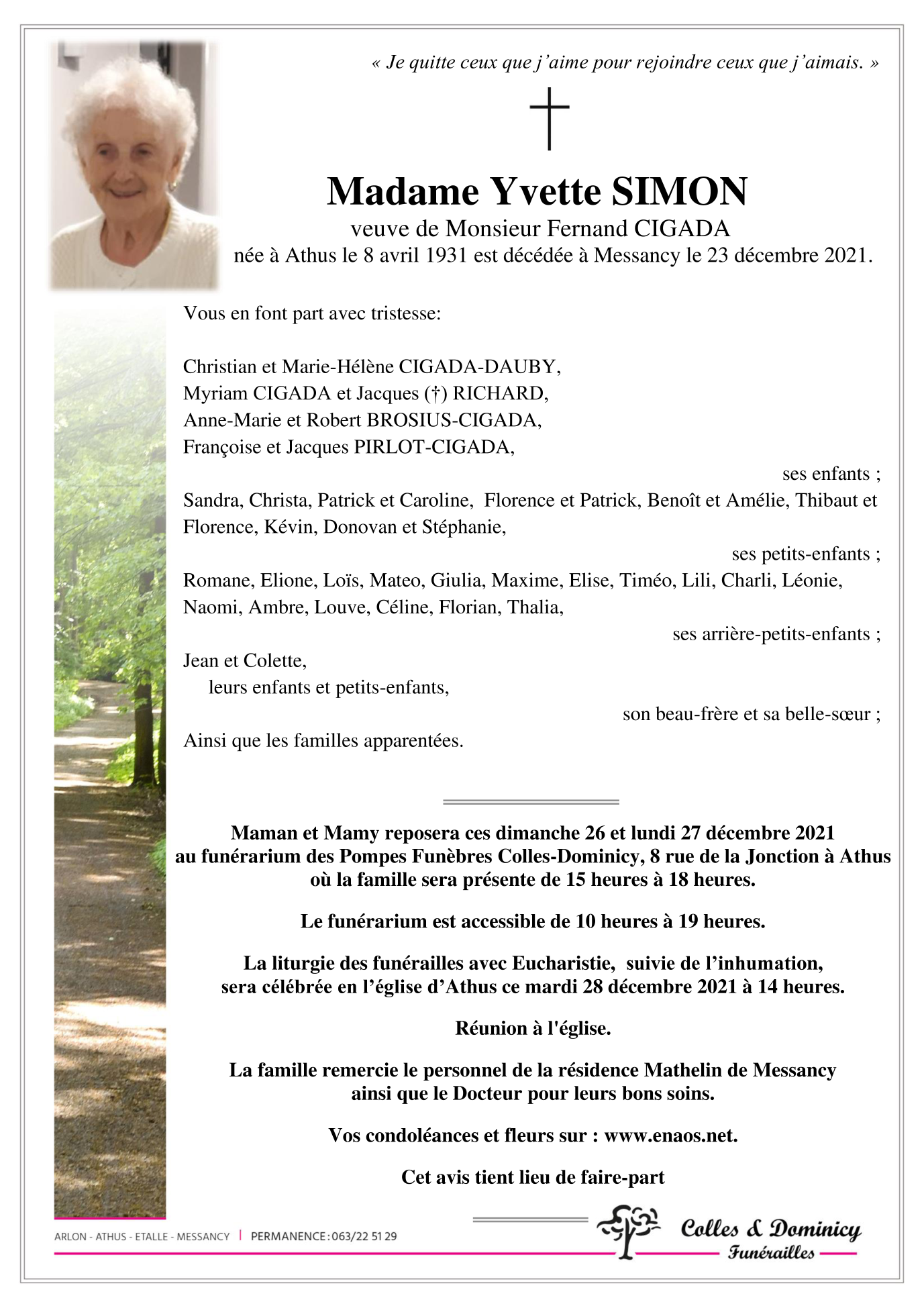 Décédée à Messancy (6780) le jeudi 23 décembre 2021 à l'âge de 90 ans