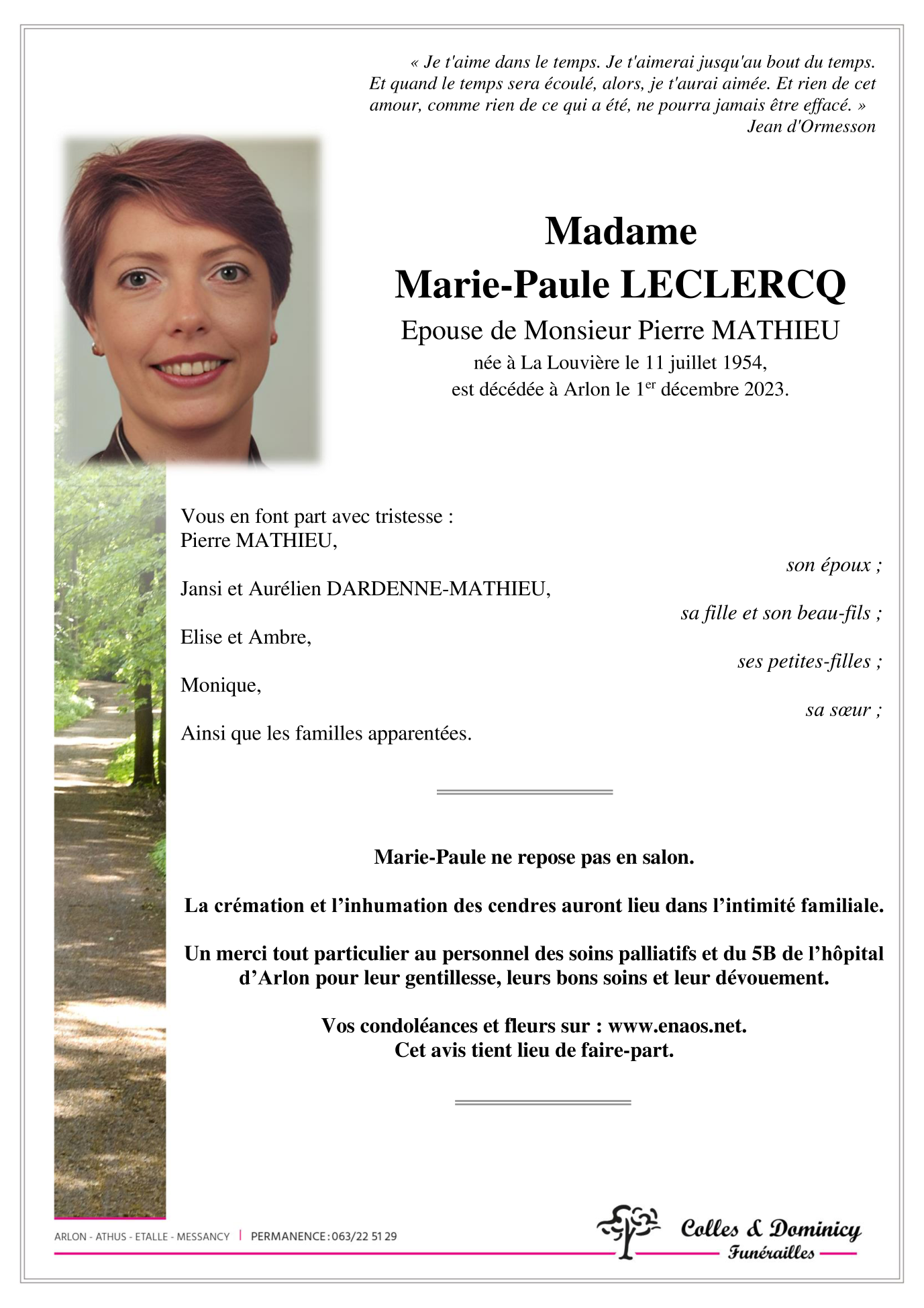 Décédée à Arlon (6700) le vendredi 1 décembre 2023 à l'âge de 69 ans