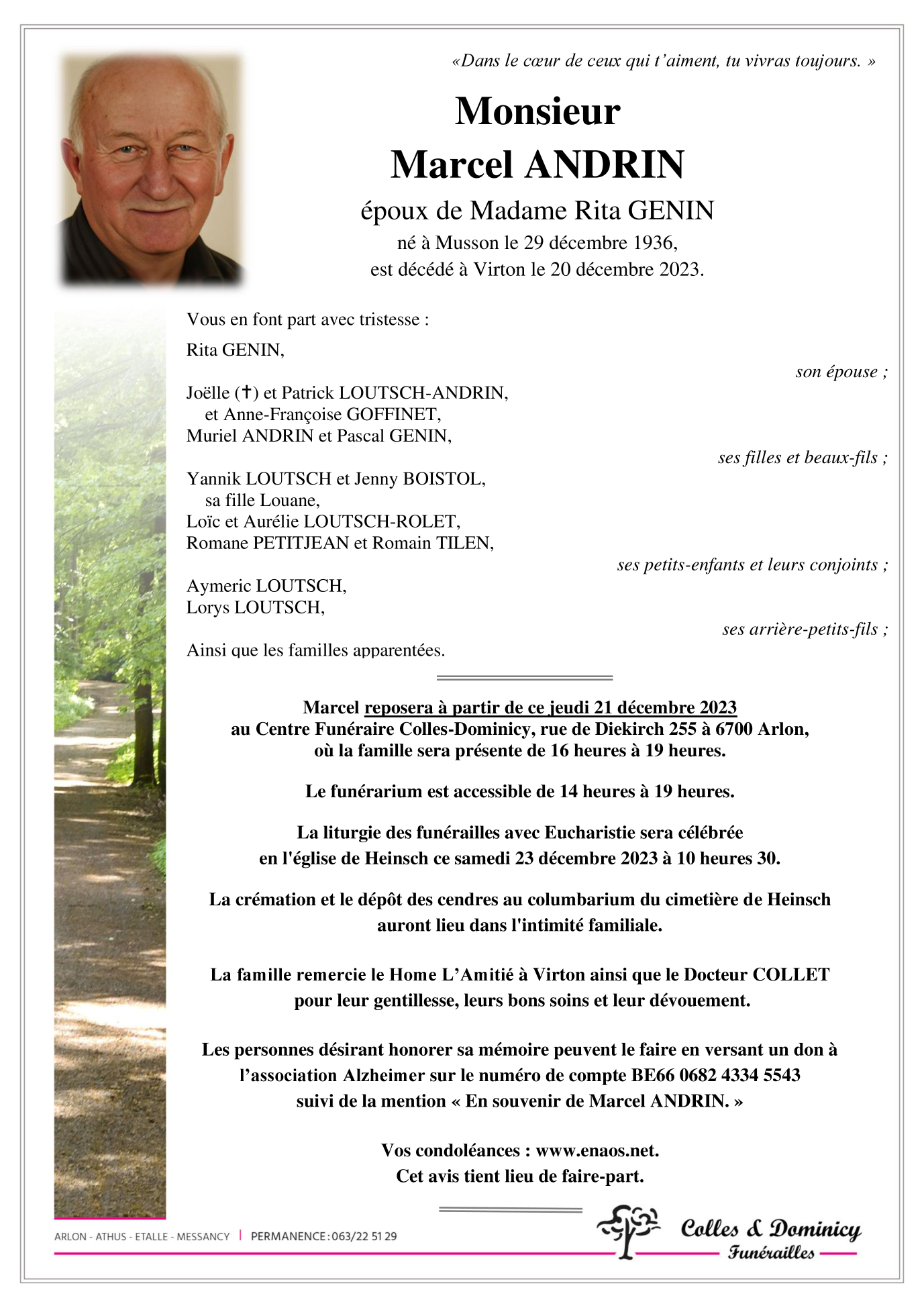 Décédé à Virton (6760) le mercredi 20 décembre 2023 à l'âge de 86 ans