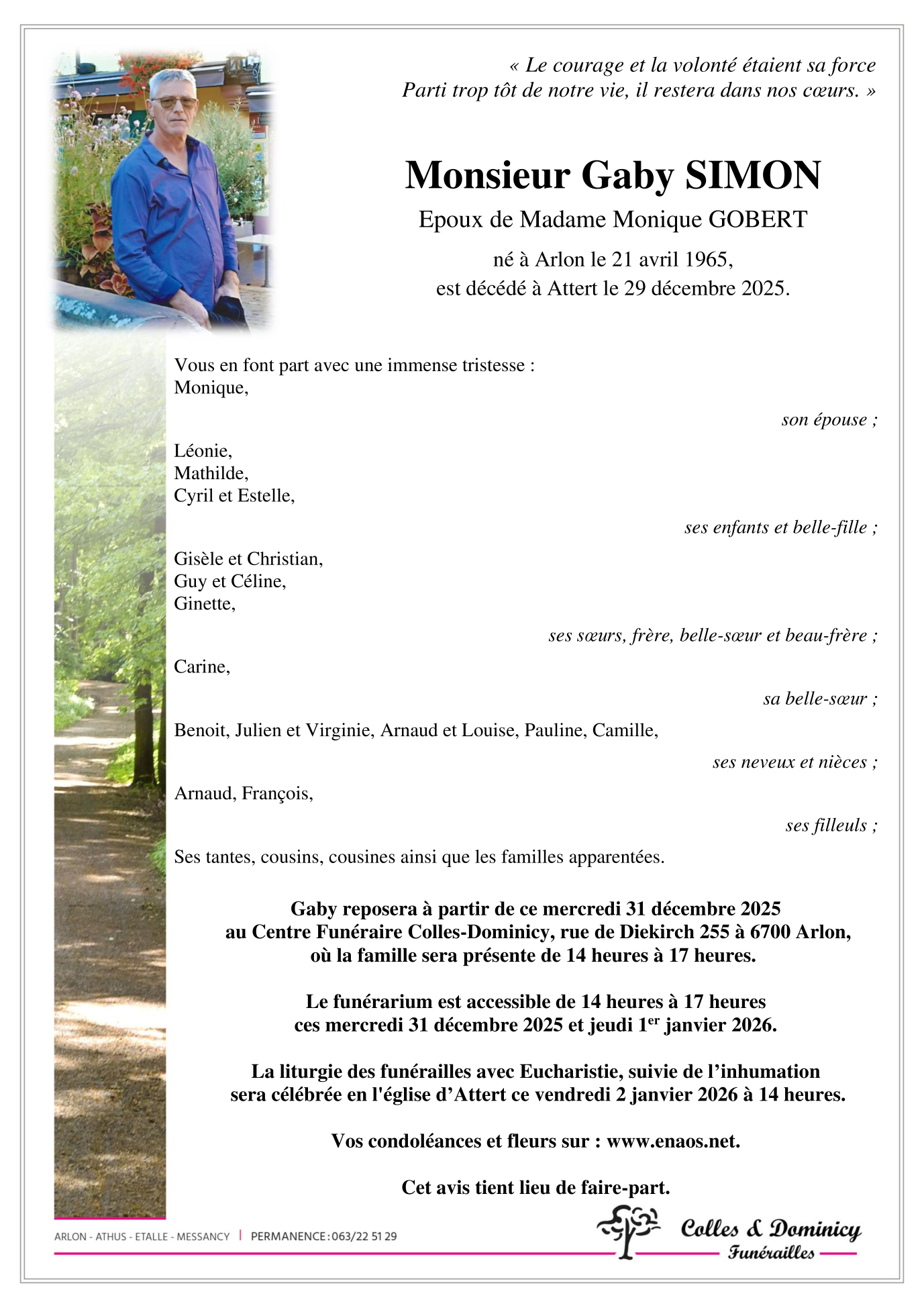 Décédé à Attert (6717) le lundi 29 décembre 2025 à l'âge de 60 ans