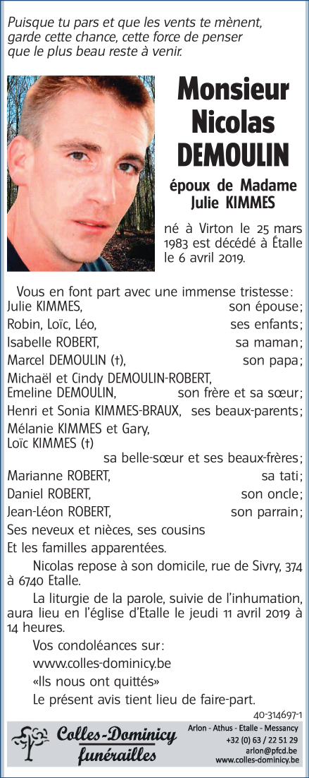 Décédé à Etalle (6740) le samedi 6 avril 2019 à l'âge de 36 ans