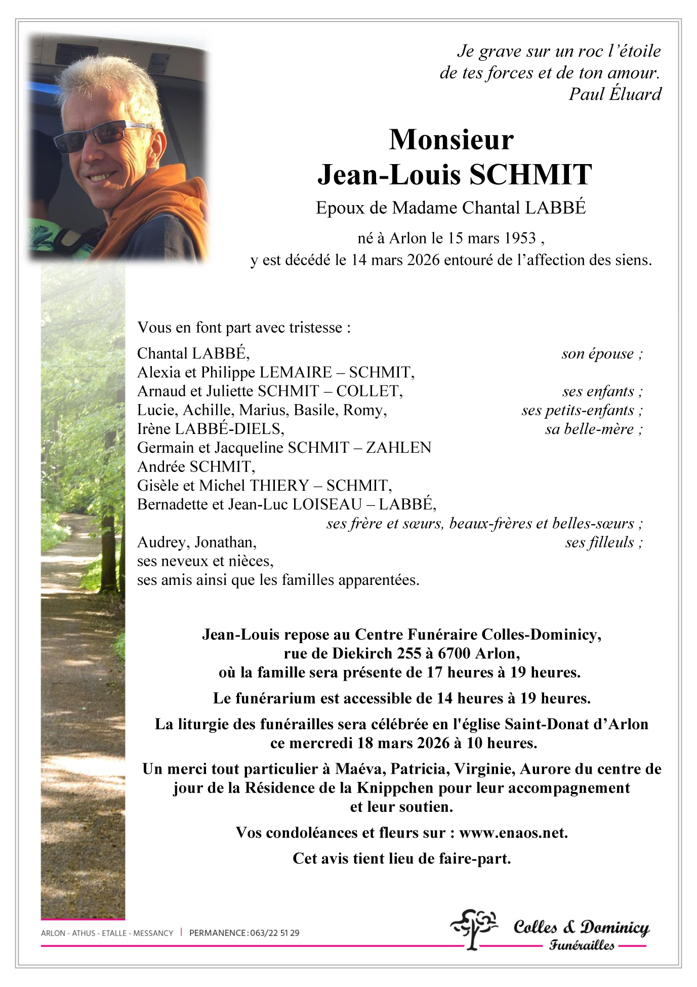 Décédé à Arlon (6700) le samedi 14 mars 2026 à l'âge de 72 ans