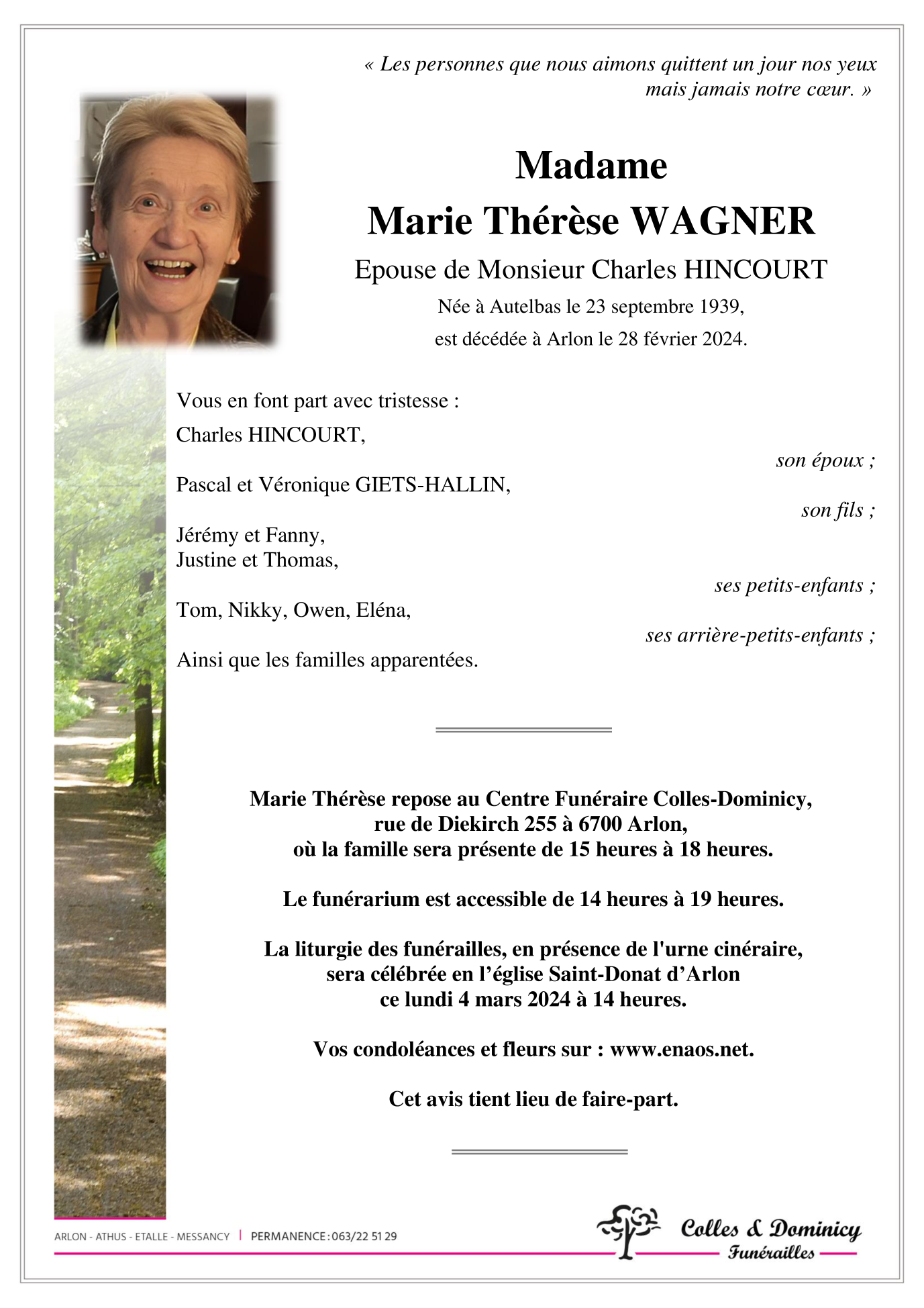 Décédée à Arlon (6700) le mercredi 28 février 2024 à l'âge de 84 ans