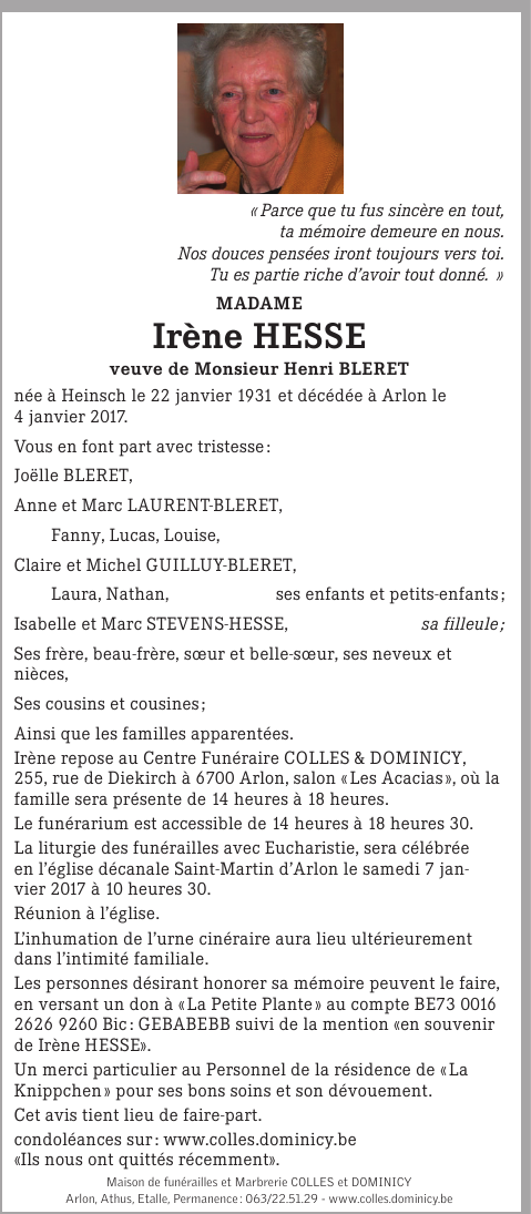 Décédée à Arlon (6700) le mercredi 4 janvier 2017 à l'âge de 85 ans