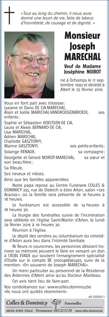 Décédé à Attert (6717) le jeudi 25 février 2016 à l'âge de 85 ans