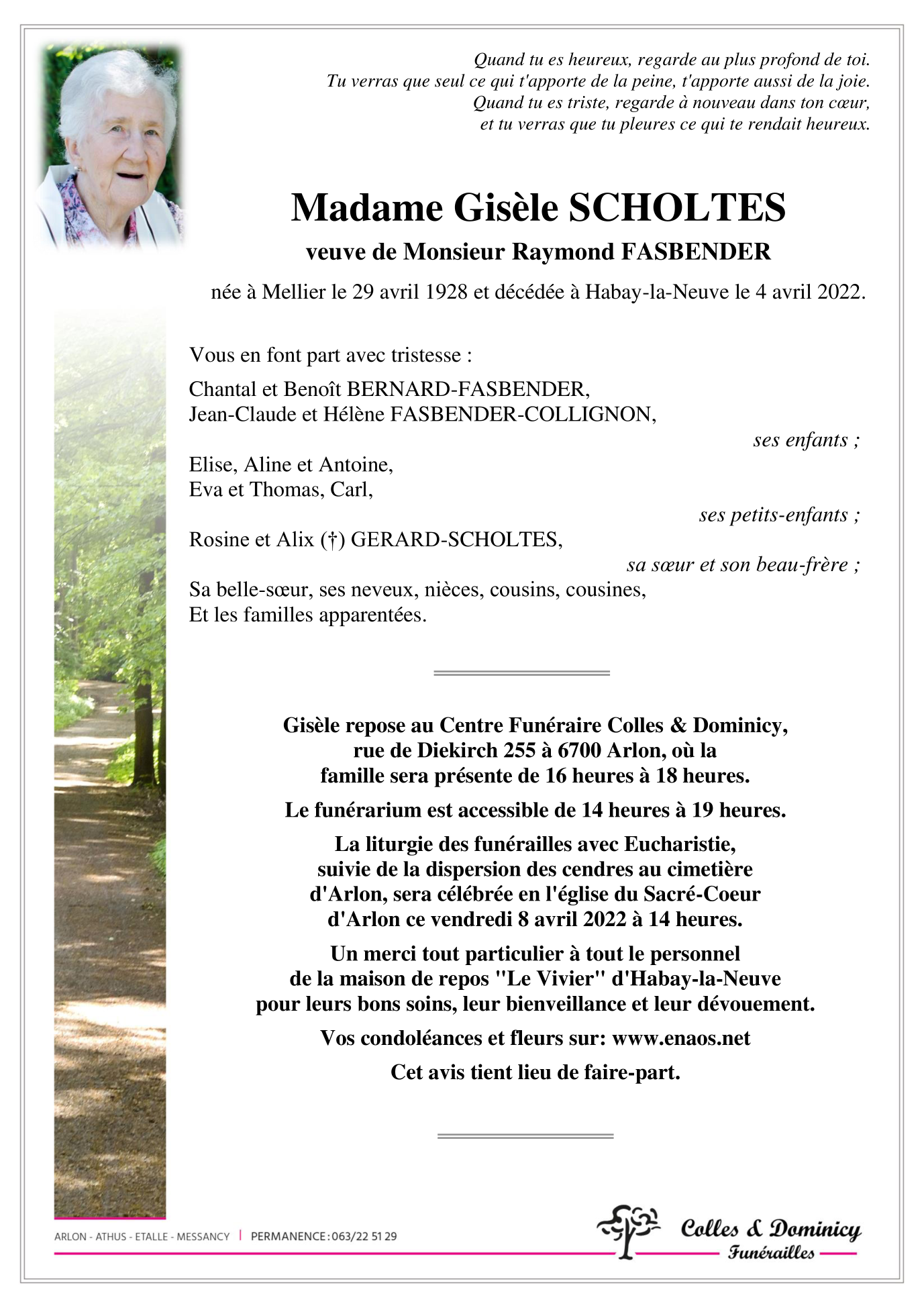 Décédée à Habay (6720) le lundi 4 avril 2022 à l'âge de 93 ans