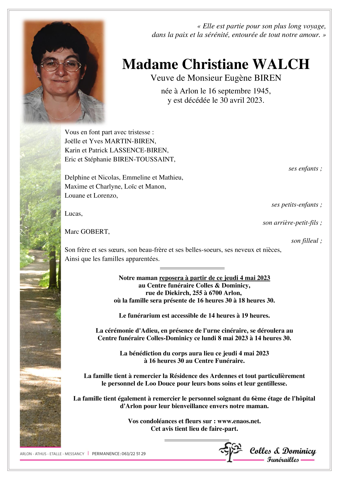 Décédée à Arlon (6700) le dimanche 30 avril 2023 à l'âge de 77 ans