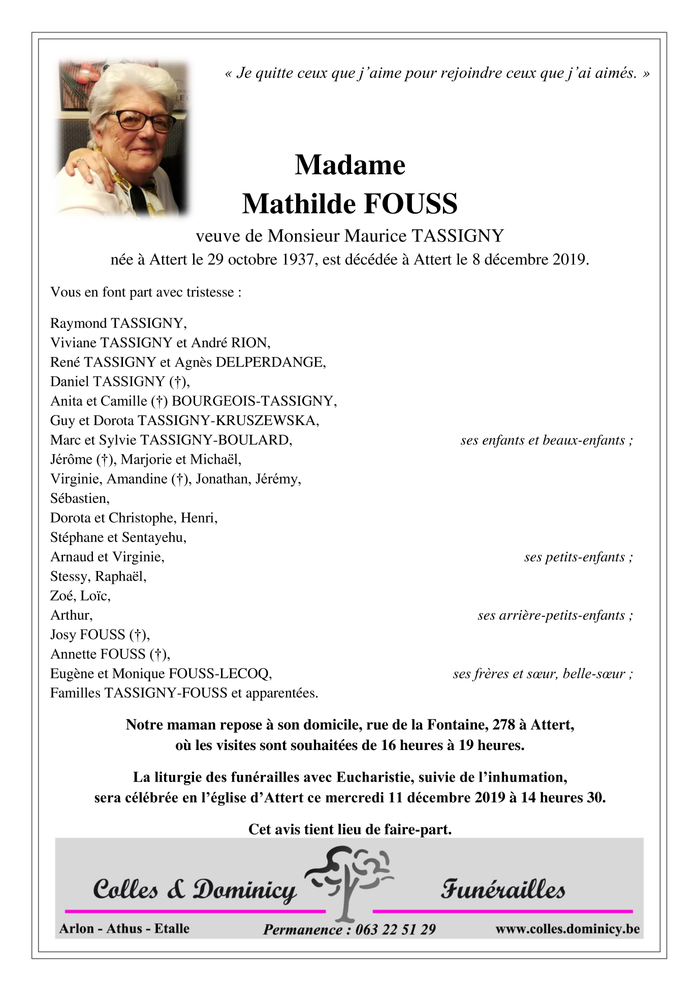 Décédée à Attert (6717) le dimanche 8 décembre 2019 à l'âge de 82 ans