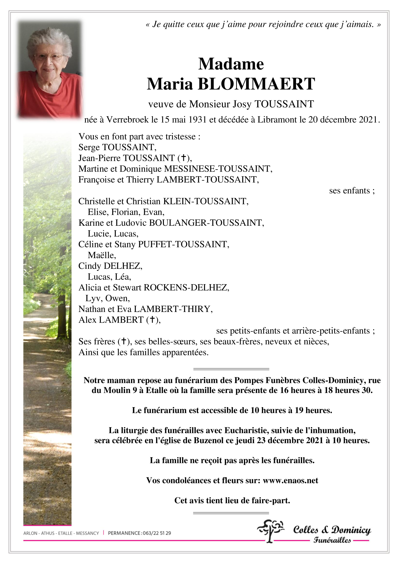 Décédée à Libramont-Chevigny (6800) le lundi 20 décembre 2021 à l'âge de 90 ans