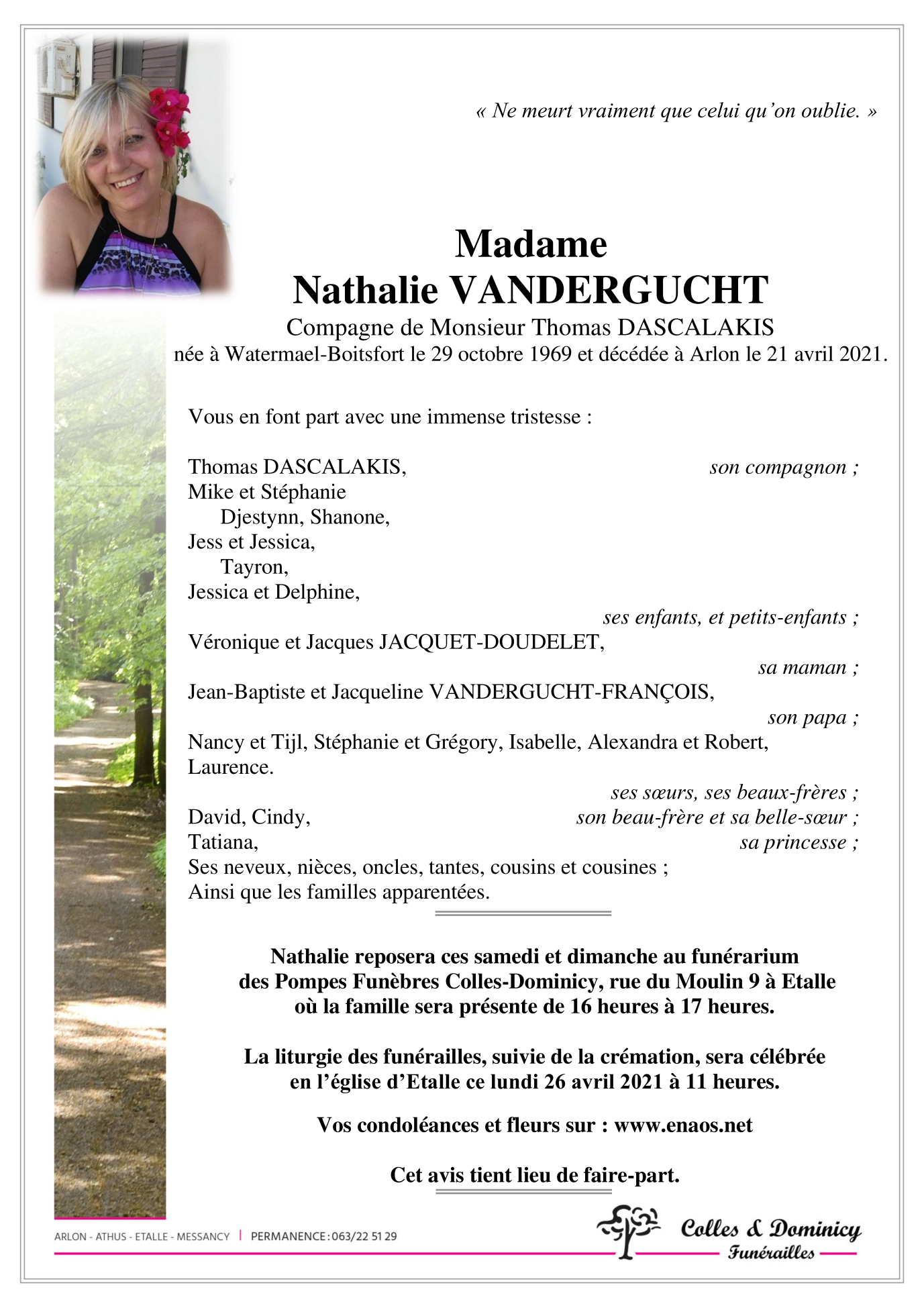 Décédée à Arlon (6700) le mercredi 21 avril 2021 à l'âge de 51 ans