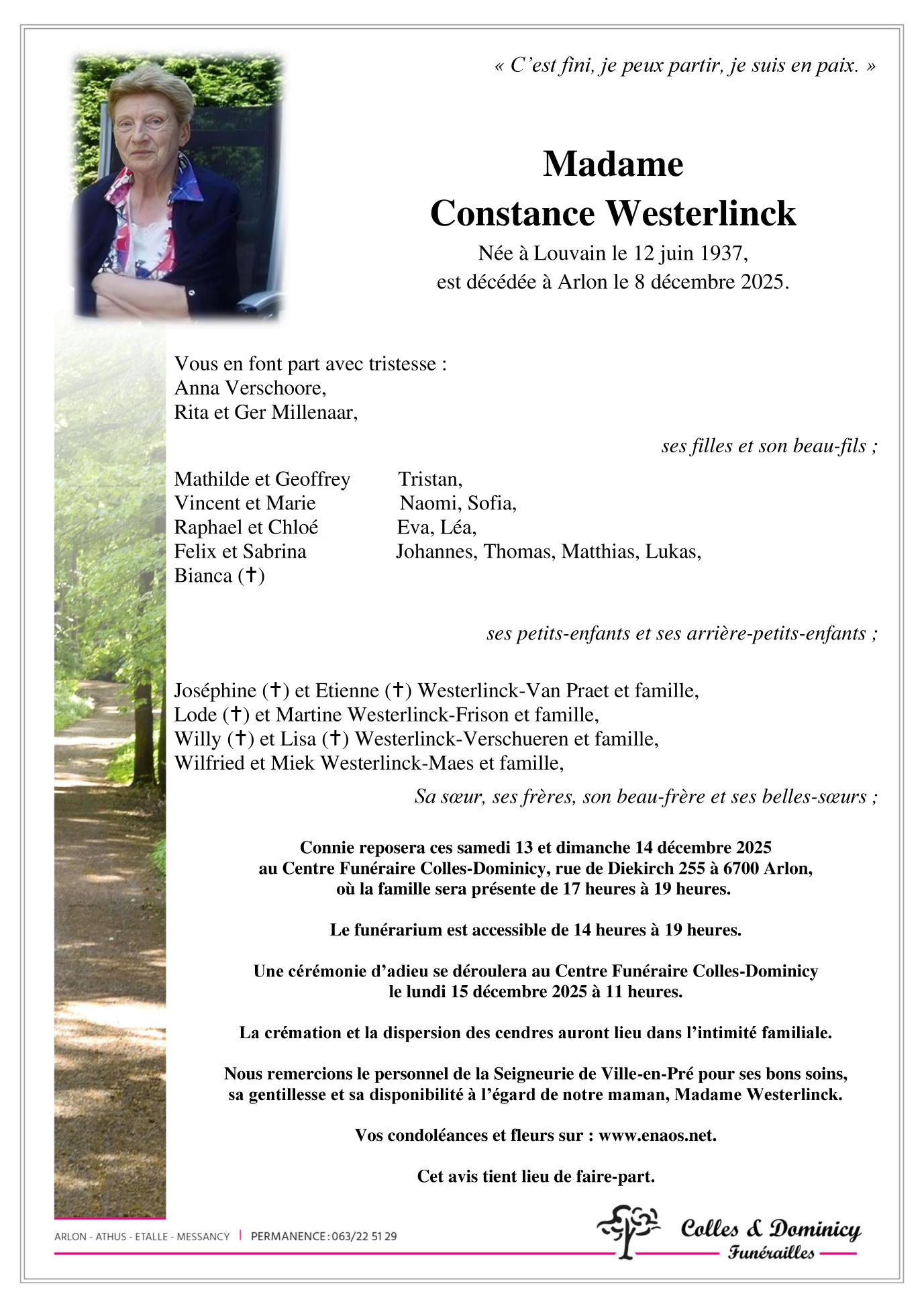 Décédée à Arlon (6700) le lundi 8 décembre 2025 à l'âge de 88 ans