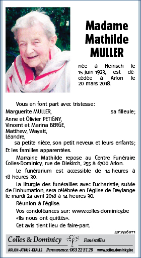 Décédée à Arlon (6700) le vendredi 20 avril 2018 à l'âge de 94 ans