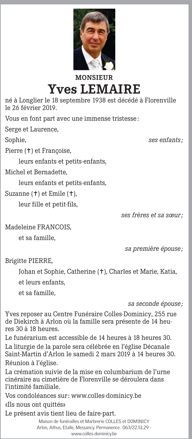 Décédé à Florenville (6820) le mardi 26 février 2019 à l'âge de 80 ans