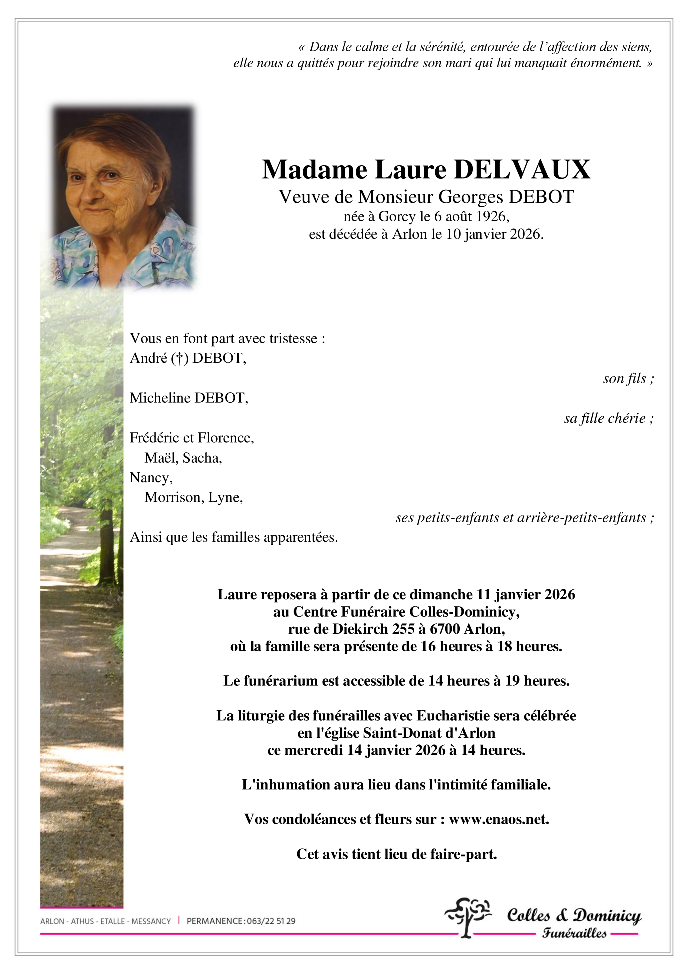 Décédée à Arlon (6700) le samedi 10 janvier 2026 à l'âge de 99 ans