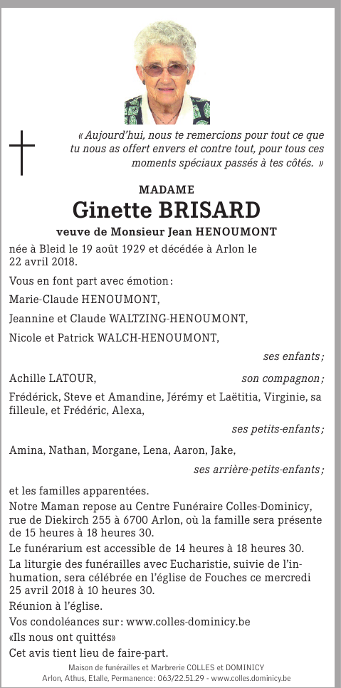 Décédée à Arlon (6700) le dimanche 22 avril 2018 à l'âge de 88 ans