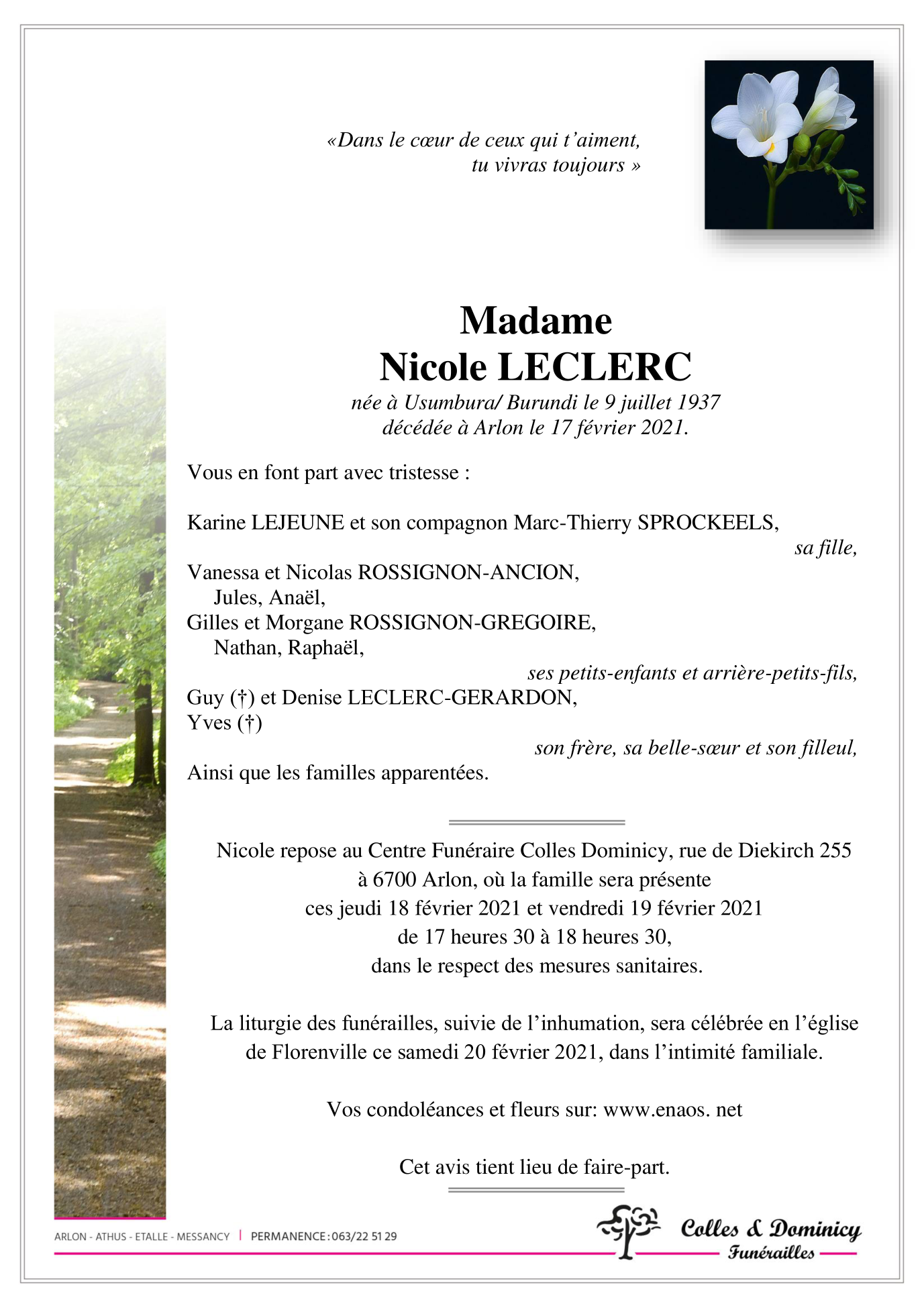 Décédée à Arlon (6700) le mercredi 17 février 2021 à l'âge de 83 ans