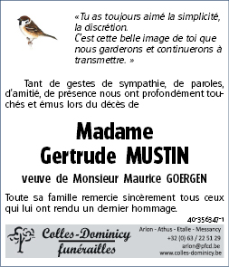 Décédée à Habay-la-Neuve (6720) le dimanche 14 mars 2021 à l'âge de 94 ans