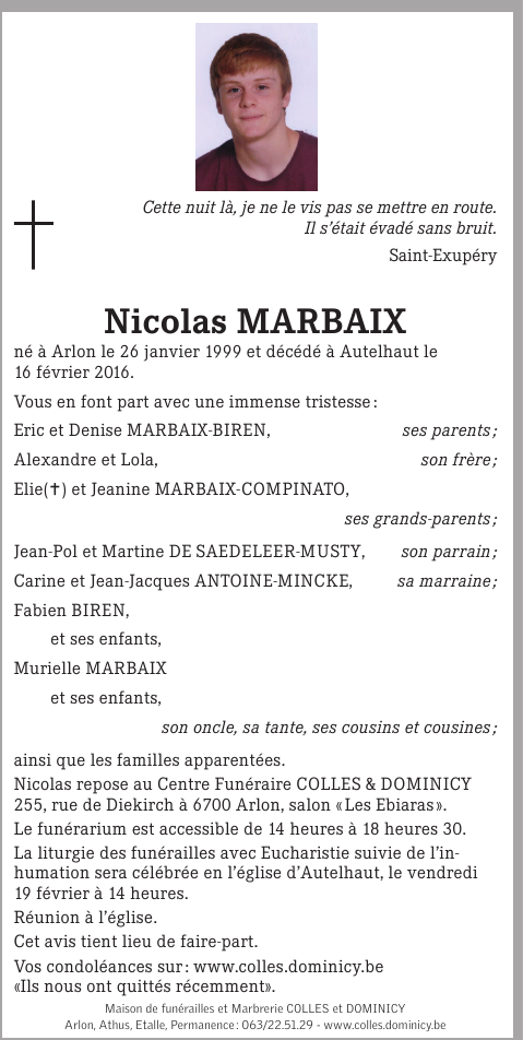 Décédé à Autelhaut (6706) le mardi 16 février 2016 à l'âge de 17 ans