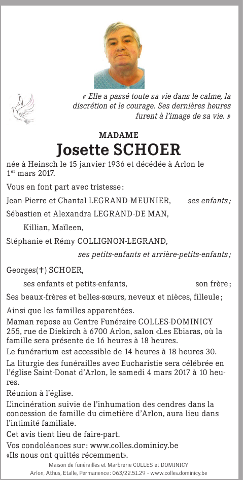 Décédée à Arlon (6700) le mercredi 1 mars 2017 à l'âge de 81 ans
