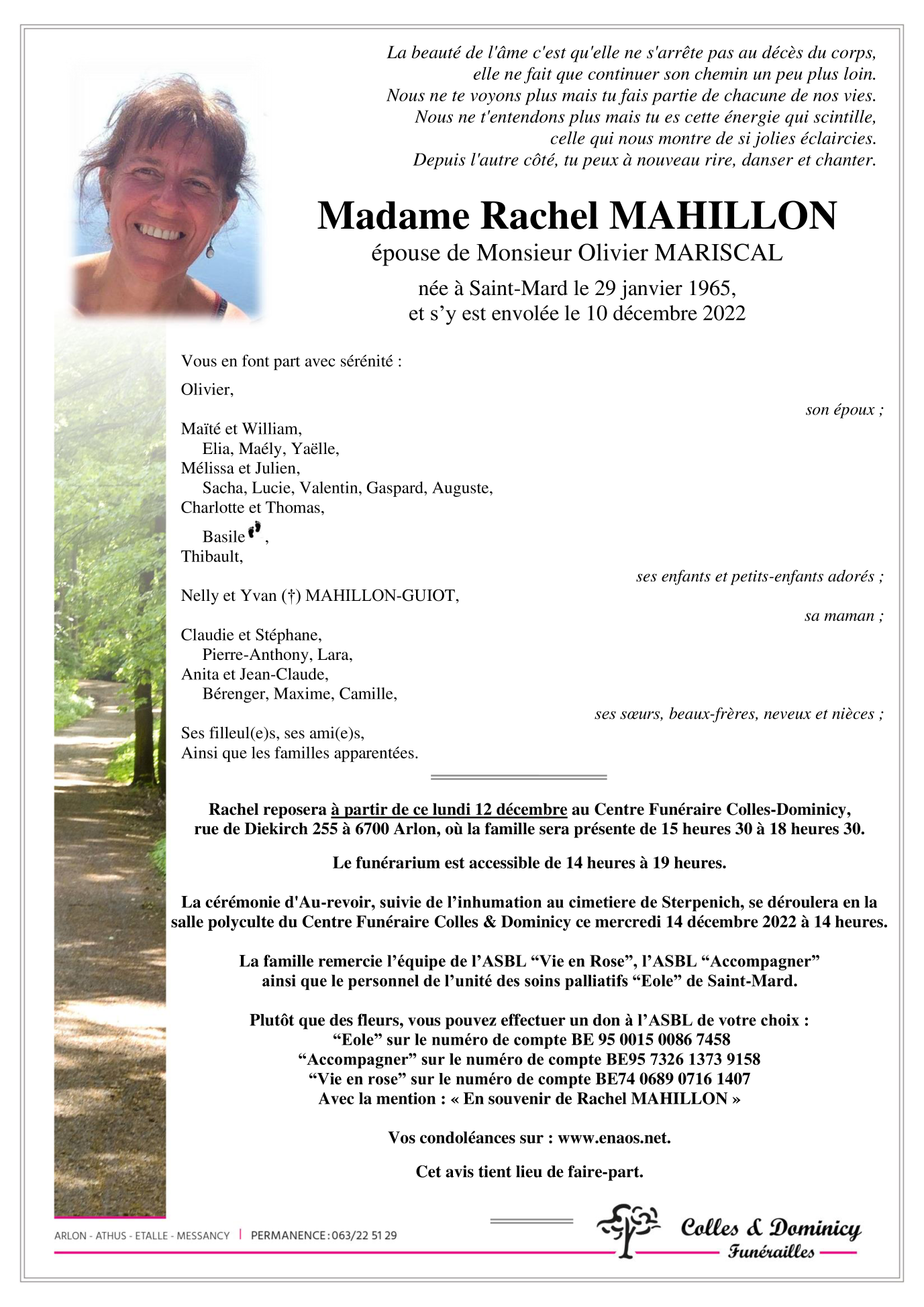Décédée à Saint-Mard (6762) le samedi 10 décembre 2022 à l'âge de 57 ans