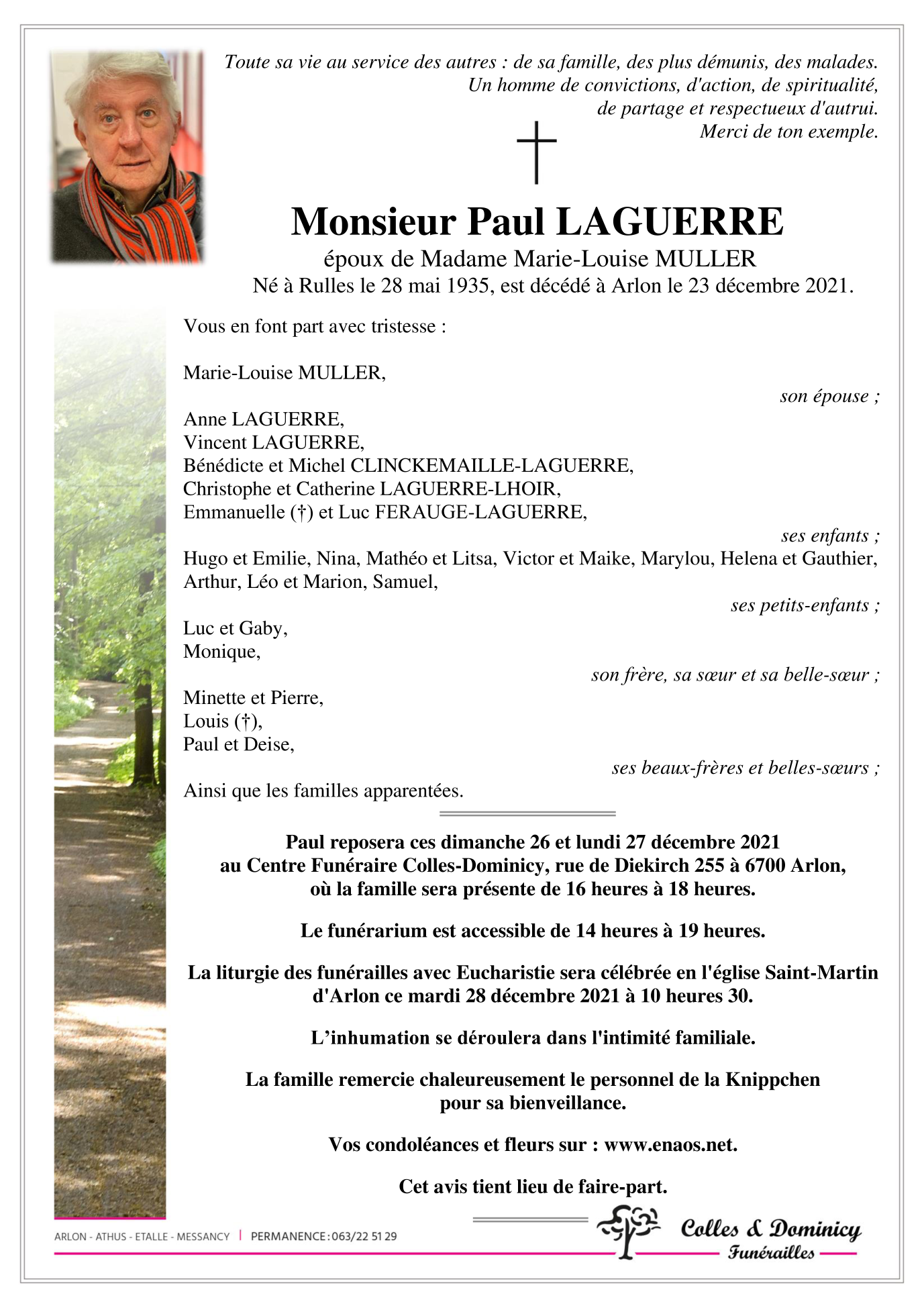 Décédé à Arlon (6700) le jeudi 23 décembre 2021 à l'âge de 86 ans