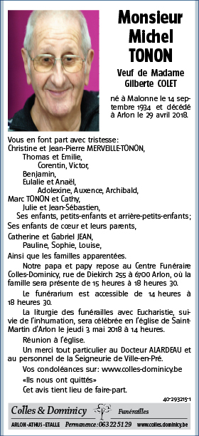 Décédé à Arlon (6700) le dimanche 29 avril 2018 à l'âge de 83 ans