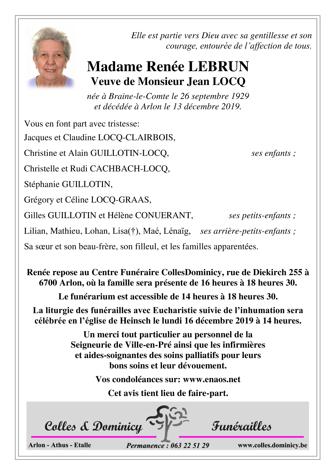 Décédée à Arlon (6700) le vendredi 13 décembre 2019 à l'âge de 90 ans