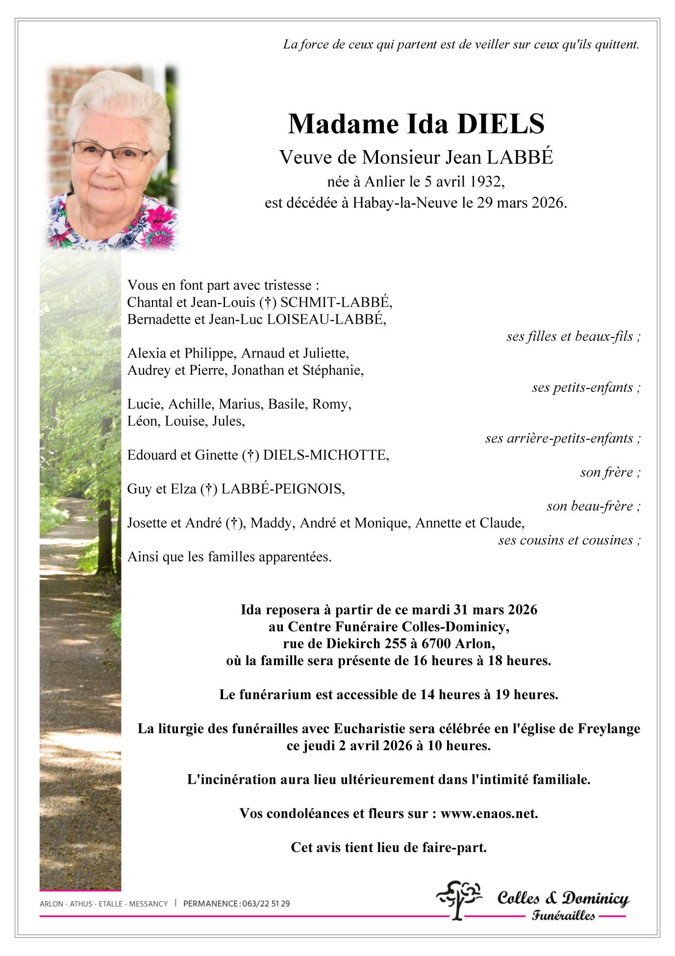 Décédée à Habay (6720) le dimanche 29 mars 2026 à l'âge de 93 ans