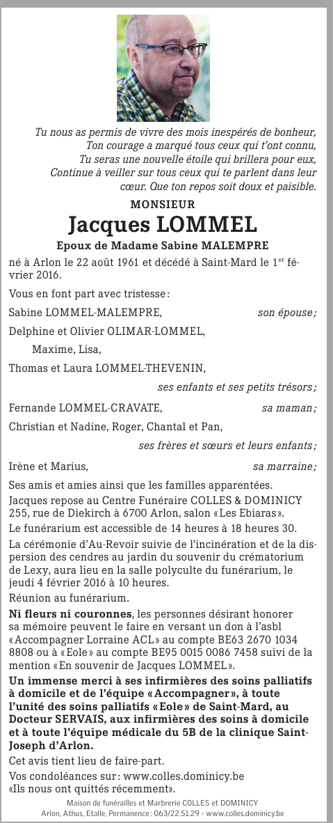 Décédé à Saint-Mard (6762) le lundi 1 février 2016 à l'âge de 54 ans