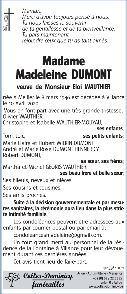 Décédée à Villance (6890) le vendredi 10 avril 2020 à l'âge de 74 ans