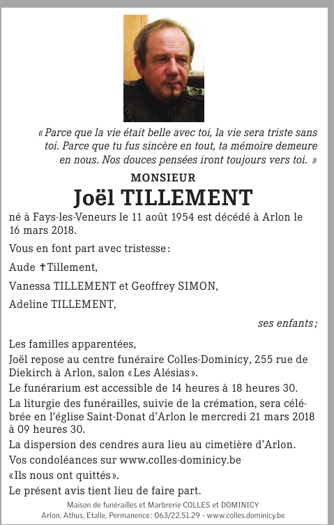 Décédé à Arlon (6700) le vendredi 16 mars 2018 à l'âge de 63 ans