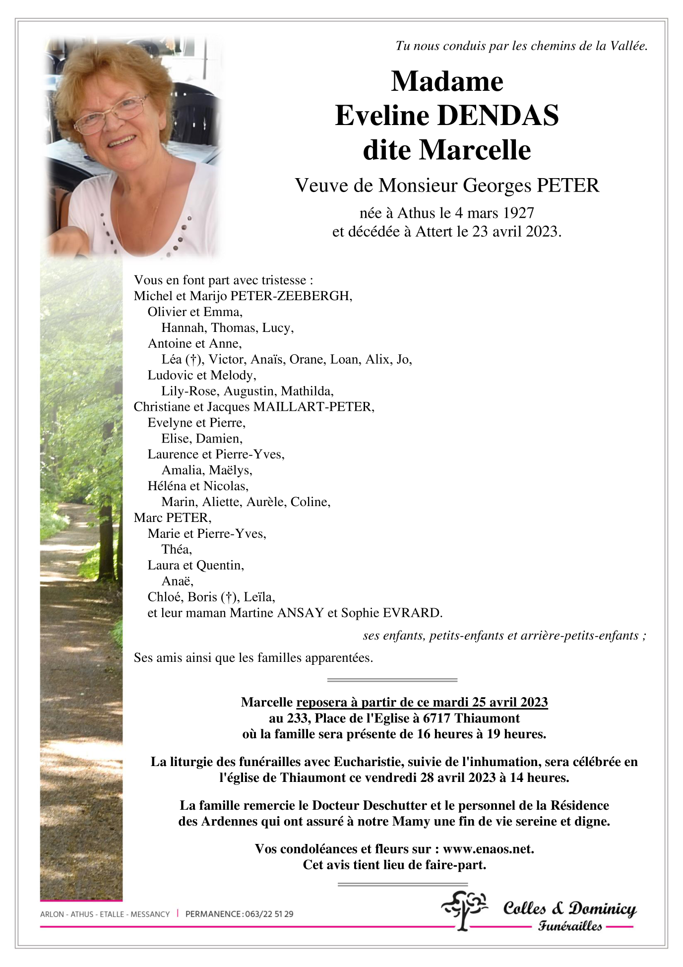 Décédée à Attert (6717) le dimanche 23 avril 2023 à l'âge de 96 ans