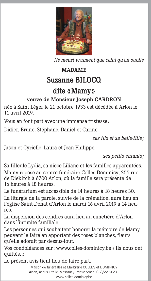 Décédée à Arlon (6700) le jeudi 11 avril 2019 à l'âge de 85 ans