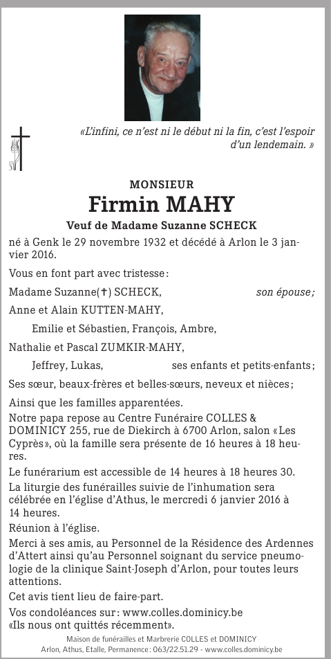 Décédé à Arlon (6700) le dimanche 3 janvier 2016 à l'âge de 83 ans