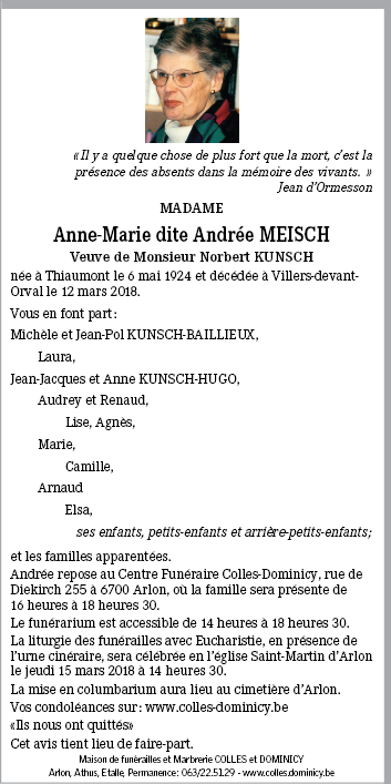 Décédée à Villers-Devant-Orval (6823) le lundi 12 mars 2018 à l'âge de 93 ans