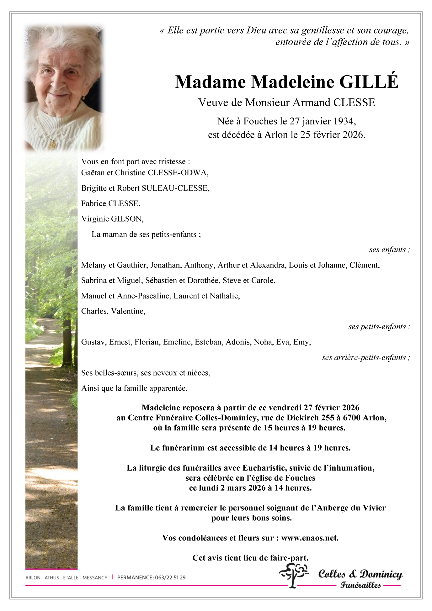 Décédée à Arlon (6700) le mercredi 25 février 2026 à l'âge de 92 ans